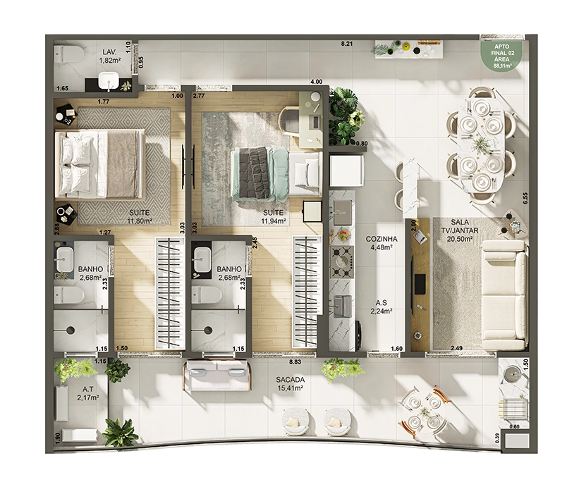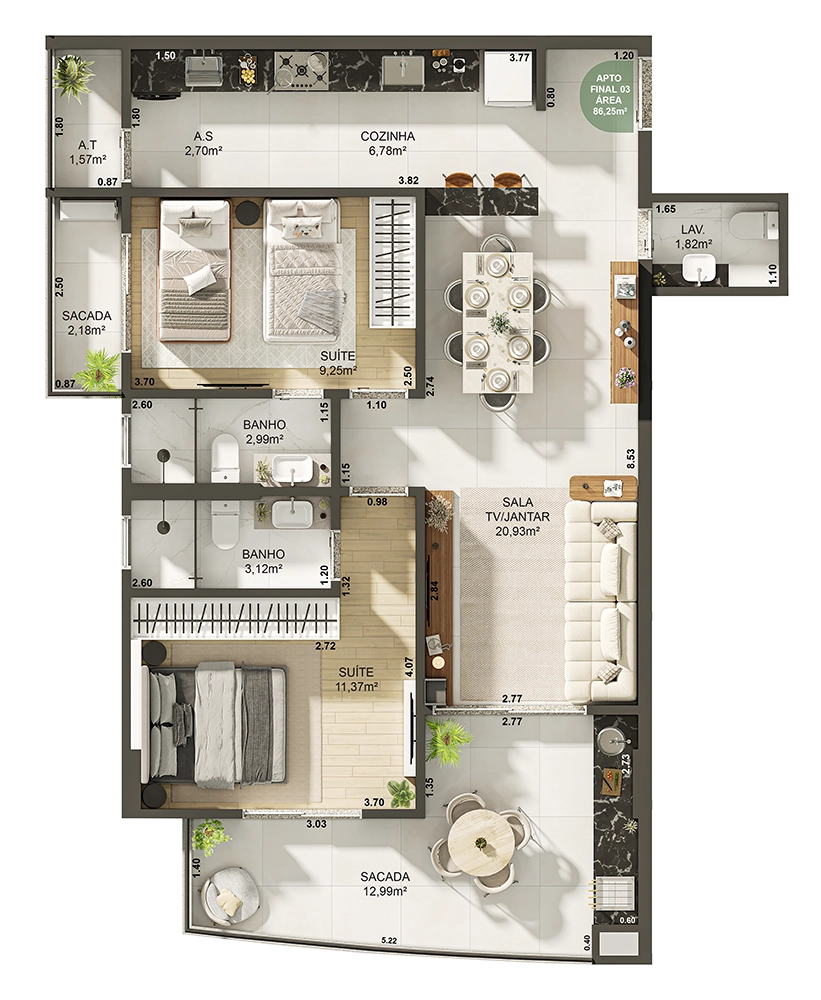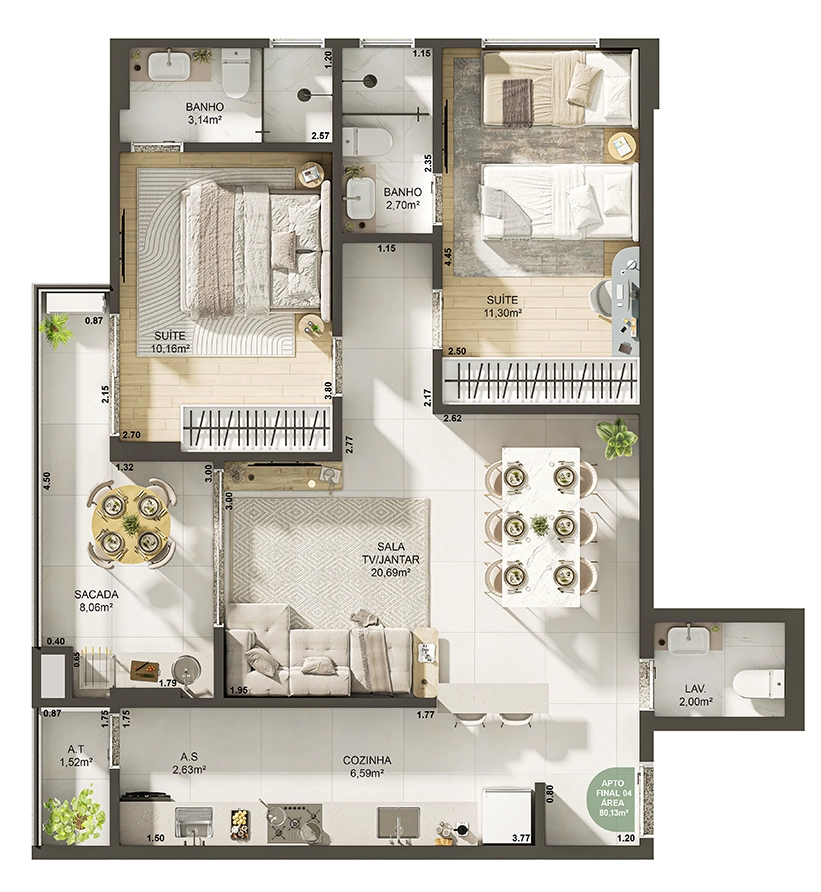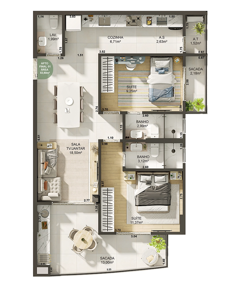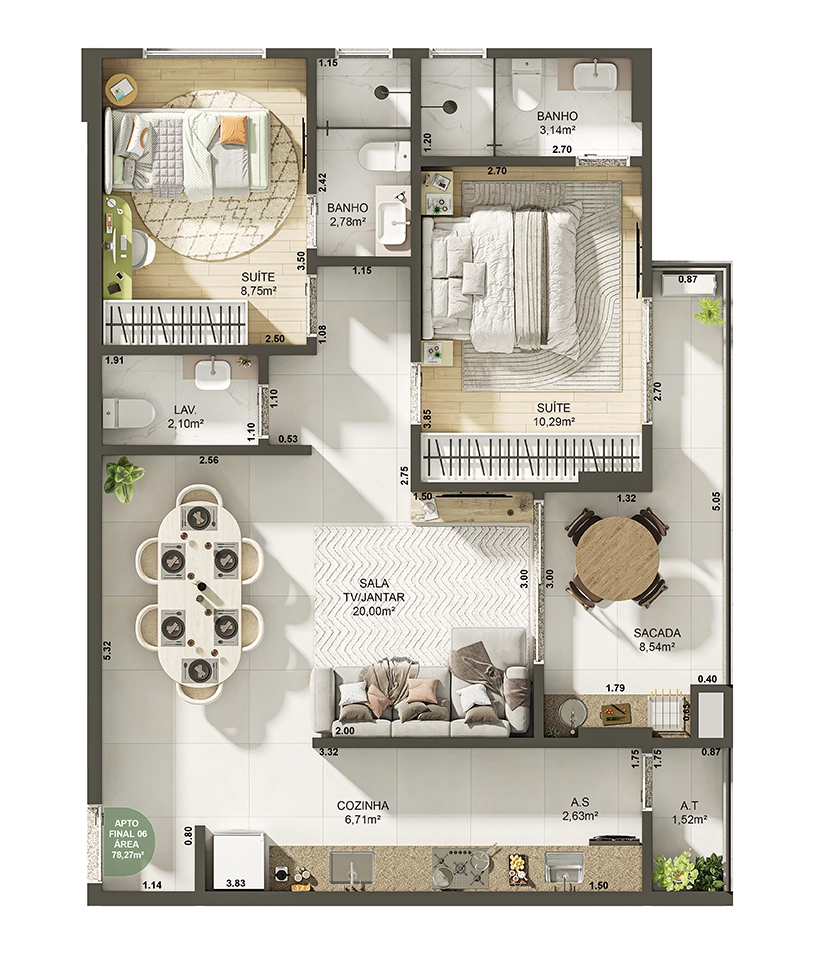 Os apartamentos contam com 78m² a 89m², 2 suítes, piso porcelanato em todos os ambientes, 1 ou 2 vagas de garagem e churrasqueira a carvão na sacada, oferecendo todo o conforto que sua família merece.